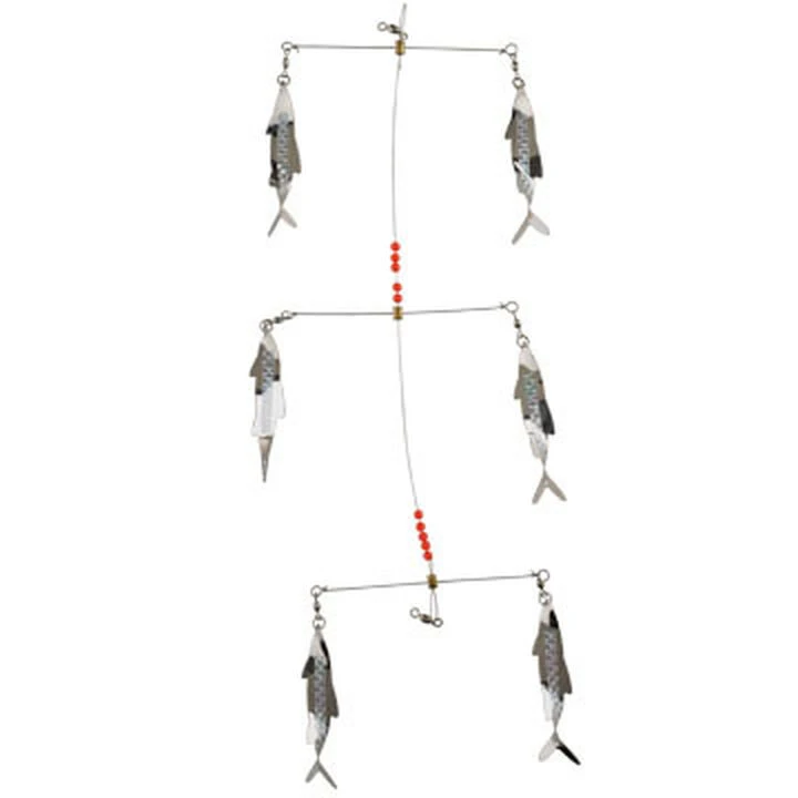 The 6-Pac Schoolie puts a whole school of realistic, shimmering baitfish behind the boat to draw close inspection from predators. Detailed whirling minnow blades pull easily while the side-by-side positioning of three pairs of blades adds depth to the illusion. Each of the six blades is approximately 3-3/4-inces in length.