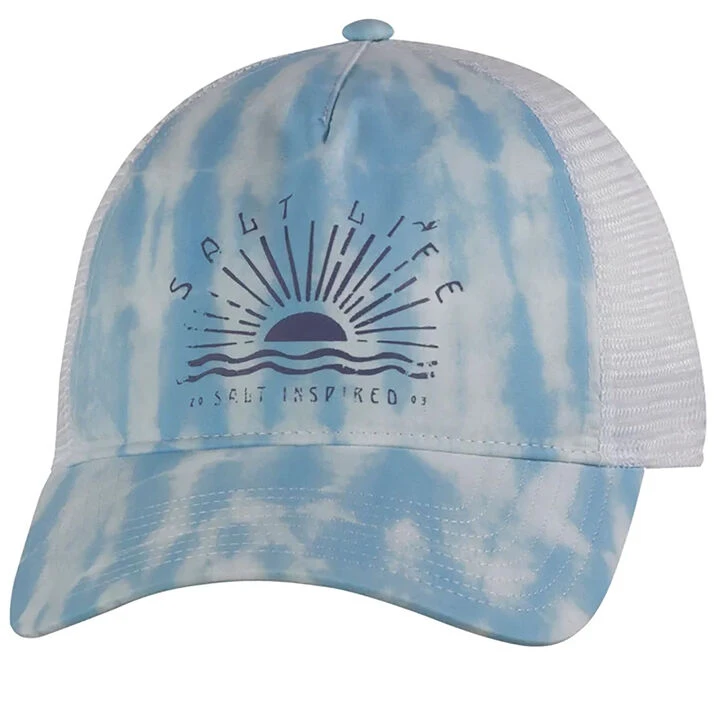 Salt Life® Women’s Suntastic Hat 5 panel snapback hat is made from Polyester Microfiber fabric with a tie dye sublimation print on the front and bill. This Salt Life® hat features trucker mesh fabric on the back and pre curved bill for a comfortable fit.